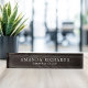 Elegante plato de nombre con su nombre y título impreso en una elegante textura de grano de madera de roble negro.