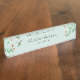 Unique name plate featuring a hand-painted female Ruby-throated Hummingbird and flowery branches on a light blue background. The font stye and size can be changed.