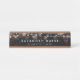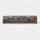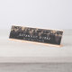 El elegante plato de nombres del escritorio, de negro brillante, cuenta con un borde superior de cadenas entrecruzadas de luces de cuerda doradas con un efecto bokeh borroso. Personalice con su nombre y título o nombre de negocio en letras blancas modernas.