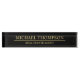 Letrero elegante profesional del escritorio del negro y del oro que ofrece su información en estilo de fuente clásico del trazo de pie del oro.