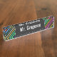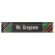 El diseño de esta placa con nombre de escritorio presenta un patrón que incluye líneas de color negro y una variedad de otros colores. También incluye un nombre personalizado en texto de color blanco dentro de un área de color oscuro. Tal vez podría usarse en el escritorio de un profesor, educador, profesor, médica, abogado o algún otro profesional. [~Z0000047]