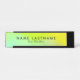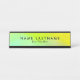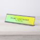 Personalizar este moderno y elegante escritorio de color verde brillante y amarillo con fuentes negras. Este plato tiene acabado metalizado negro, se puede cambiar esto a otras dos opciones, para subió el acabado metalizado de oro o plata.