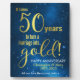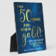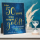 Un fabuloso diseño personalizado para el 50 aniversario de boda. Este diseño temático del espacio azul es una forma hermosa de enviar un sentido mensaje de aniversario de boda. La tipografía dorada dice 'Se necesitan 50 años para convertir un matrimonio en oro'. Un diseño personalizado elegante en azul y dorado que seguro les encantará.