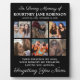 Placa conmemorativa de fotos personalizadas que incluye 6 fotos preciosas de su ser querido fallecido, el texto "en cariñoso recuerdo", su nombre, fechas de nacimiento y fallecimiento, y el dicho de recuerdo "extrañamos tu presencia, atesoramos tu memoria, te queremos siempre, nunca te olvidamos".
