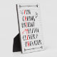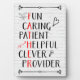 El signo del Día del Padre para papá con palabras descriptivas, incluyendo diversión, cuidado, paciente, útil, inteligente, proveedor, con ciertas letras que deletrean la tarjeta "PADRE" tiene el angustiado fondo de ladrillo blanco y conejo, corazón, flecha y doodles de bombilla.