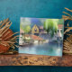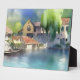La placa artística de mesa presenta una escena acuarela digital generada por IA de una encantadora aldea alemana en el río.