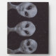 Dibujo a lápiz de color de tres ETs de color gris alienígena contra un cielo negro estrellado.