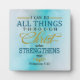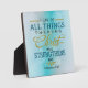 The wonderful words from Philippians 4:13 are in colors of black, teal and gold on this inspirational desk plaque. The text is placed on a lighter teal bokeh background. Thanks to ReadytobeCut for the text used in this design.