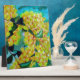 con el arte original de la pintura acuarela del artista australiano Sacha Grossel de un brillante árbol amarillo de Acacia, la flor dorada Wattle - el emblema floral oficial de Australia. Este vibrante árbol nativo florido produce una masa de flores aromáticas, onduladas y doradas en los colores nacionales verde y dorado de Australia. Para los amantes de la botánica y la gente que aprecia las flores nativas australianas.