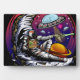 Arte vectorial original de un astronauta que tiene queso de luna y pasa una tajada a un alien. Creado en vector.
