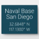 Coordenadas de mapas de latitud y longitud para la base naval de San Diego en California - también conocida como Estación Naval de la Calle 32, hogar del tipo de letra blanca estilo Roboto de la Flota del Pacífico sobre fondo azul marino.