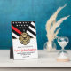 Este diseño cuenta con una bandera de bomberos con rayas blancas y negras y una delgada franja roja. "Felicitaciones" y el texto de la insignia del bombero se sienta por encima del nombre del bombero, teniente o jefe que se gradúa o se retira. ¡Celebren con estilo!