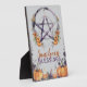 Share your holiday spirit with this beautiful Blessed Samhain Pentacle & Fall Pumpkins altar plaque featuring lovely dark purple Pentacle with pumpkins, leaves, flowers, and candles.