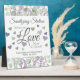 Este signo está diseñado teniendo en cuenta a un boda pandémico. Cuenta con un bonito diseño acuático pintado a mano de hojas de eucalipto y lavanda en tonos verde salvia y violeta claro. El texto dice: "Estación de Sanitizing. Difunde amor no gérmenes" y está rodeado de corazones festivos. Hay espacio para los nombres de la pareja y la fecha del boda. Una buena manera de animar a sus invitados a que ayuden a mantener a todos seguros y sanos.
