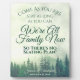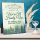 Este hermoso cartel o placa le hará saber a sus huéspedes que no hay un plan de asientos para que puedan sentarse donde quieran. Presenta un diseño rústico con pinos verdes envueltos en niebla o niebla. El texto dice: Ven como eres, quédate todo lo que puedas, somos familia ahora, así que no hay plan de asientos. Perfecto para un patio trasero o una boda al aire libre.