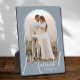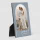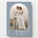 Un recuerdo especial incluye tu foto de boda en un diseño de arco elegante con el texto "Casados" en texto chic junto con tus nombres y fecha de boda en un fondo azul polvo. Hermoso regalo para tu familia y un recuerdo fabuloso para mostrar en tu propia casa. ¡El COLOR del fondo se puede cambiar! MÁS COLORES en nuestra colección.