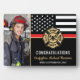 Este diseño cuenta con una bandera de bomberos con rayas blancas y negras y una delgada franja roja. "Felicitaciones" y la insignia de un bombero se sienta por encima del nombre del bombero que se graduó. Este diseño también funciona bien para los bomberos, lugartenientes o jefes que se retiran. ¡Celebren con estilo con este cartel de fotos de personalizable!