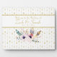 El hermoso ilustracion acuático Boho presenta flores y plumas sobre blanco con fondo de flechas doradas. Personalizar con los detalles de la pareja boda