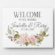 Bonito, moderno y elegante cartel de la tablilla de boda presenta ramo de roses rosados de bonito con texto de personalizable completo en fuentes grises complementarias. Añadir el boda de parejas / detalles de compromiso / recepción