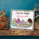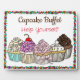 Un cartel de boda o de ducha de bebé para un bizcocho. Gráficos dibujados a mano de pastelitos de chocolate, fresa y vainilla con salpicaduras.