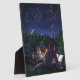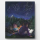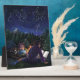 El arte nocturno estrellado de Traci Van Wagoner print, posters, accesorios y regalos presenta nuestra pintura original de dos niños y su perro negro grande acampando bajo las estrellas leyendo un fantástico libro alrededor de un incendio en un campamento sobre caballeros y dragones. La magia de la historia se desliza hacia el cielo estrellado para mostrar un caballero y un dragón en un eterno baile nocturno de estrellas. Disfrute de un campamento nocturno de verano en las montañas.