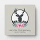 Una placa fotográfica personalizada con tu nombre y título. Diseñado con una cabeza de ciervo negra con grandes cuerdas. Las líneas geométricas dentro de la cara del ciervo agregan un toque creativo. Flores rosas y coloridas hojas verdes de menta forman un ramo floral de bonito bajo su cabeza. Un sketch de cordillera colocado entre las flores también le da un toque rústico al campo.