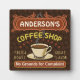Esta placa con motivos de café es perfecta para quien maneja su propia cafetería o tenga una temática de café en la decoración de su cocina. Hecho en marrón retro, naranja, beige y amarillo, este diseño inspirado en el espresso / capuchino presenta una taza en un platillo, dos banderas de texto personalizadas y las palabras "Cafetería / asado fresco / gran sabor" en amarillo. La taza está humeante y la pancarta superior tiene movimientos que imitan el humo. Todo descansa sobre un fondo oscuro de café-frijol. Utilice las plantillas para agregar fácilmente su nombre. También puede cambiar el lema final si lo desea, que actualmente dice "Sin motivos para la queja". Si necesita cambiar el tamaño del texto para ajustarlo, haga clic en "Personalizar". Tome una taza de Joe y disfrute de su propia placa de café personalizado.