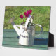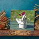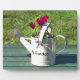 Una divertida acuarela de una pequeña lata de agua con un ciclamen plantado en ella.