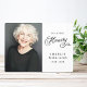 En memoria funeral placa conmemorativa con su foto y el texto "en memoria" con "memoria" en una fuente de caligrafía elegante. A continuación están el nombre y las fechas u otro texto personalizado. Mensaje personalizado en la parte posterior.
