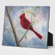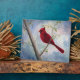De una pintura original de medios mixtos de Brenda Thour de un cardenal rojo varón sentado en una rama de árbol desnudo con un cielo abstracto azul y rosa. Derechos de autor de Brenda Thour 2005.