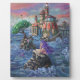 Si amas a las sirenas, entonces esta pintura es para ti. El Castillo de la Sirenita pintado por Traci Van Wagoner presenta una sirena con el pelo púrpura delante y una sirena con el pelo verde que se solea en las islas rocosas, mientras que otra sirena con el pelo rosado nada en el océano frente a un castillo con un cielo morado, naranja y amarillo atardecer detrás. Este hermoso y caprichoso arte de fantasía hace un gran regalo y una impresionante decoración para tu oficina o casa.