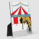 Circus Elephant montando una bicicleta con una carpa de circo rojo y blanco