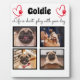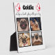 Celebra a tu mejor amigo con un collage de fotos personalizado. Cuando tienes tantos recuerdos divertidos y fotos, una foto no es suficiente. Esta placa tiene 4 fotos, una cita y puedes personalizar el nombre de tu mascota. También puedes cambiar el color de la huella de la pata. Para personalizar, puedes cambiar el color y la fuente, ingresar tu propia cita y subir tus propias fotos o incluso cambiar el color de fondo. Ya sea que tengas un cachorro nuevo o simplemente quieras conmemorar todos tus momentos especiales, cada perro merece un recuerdo familiar personalizado.