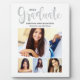 Simple y elegante cartel de placa de graduación con las características "Graduado 2025" en un moderno guión de caligrafía gris plateado con un moderno collage de fotos de cuatro (4) retratos senior de la graduación.