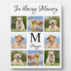 Honre a su mejor amiga con una placa de collage de fotos conmemorativas de un mascota personalizado en un diseño blanco y negro. Esta monogramada placa monográfica inicial y placa conmemorativa del perro de recuerdo de la foto de nombre es el regalo perfecto para usted, familia o amigos para honrar a los seres queridos. Esperamos que la visualización de la foto de tu perro en la placa de la memoria te traiga alegría, paz y recuerdos felices. Personalizar con 8 de sus fotos favoritas de mascotas, monograma inicial y nombre personalizado. Vea 'personalizar esta plantilla' para cambiar fotos , iniciales y nombre . Es mejor recortar las fotos centradas antes de subir. DERECHOS RESERVADOS © 2020 Judy Burrows, Black Dog Art - Todos los derechos reservados. Collage de fotos moderno en placa conmemorativa de Mascota de memoria amorosa