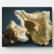 Fotografía de la vida de tres grandes conchas en un fondo azul.