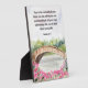 El cartel de arte de verso de la Biblia con stand muestra el verso de Proverbs 3:5-6 impreso sobre una bella escena paisajística con flores rosas y un puente sobre el agua. La señal de decoración de casa es una manera encantadora de mostrar la palabra de Dios en tu casa. El versículo de la Biblia dice: "Confía en el Señor con todo tu corazón, y no se inclina en tu propio entendimiento; en todos tus caminos lo reconoces, y Él dirigirá tus caminos". De Proverbs 3:5-6. El Rótulo es un encantador regalo de boda, un regalo para el hogar o cualquier regalo de ocasión para los amigos cristianos.