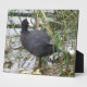 Esta impresionante placa muestra una fotografía de un Coot parado a orillas de un río. El pájaro es negro con un parche blanco en la cabeza. Tiene el cuello girado y está mirando sobre su hombro hacia la vegetación en la orilla del río.