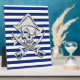 Un cromo plateado como un diseño pirata en una decoración de rayas azul marino. Un regalo náutico moderno. Utilice el enlace "Mensaje" para contactarnos con sus solicitudes de diseño especiales o para obtener alguna ayuda con cualquiera de sus necesidades de proyectos de personalización.