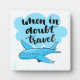 Cuando en duda viajan. Cita motivacional en fondo de nube azul con avión, tipografía de pincel para poster, camiseta o tarjeta. Arte de caligrafía vectorial. | Bigstock® - Todos los derechos reservados.