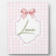 Agrega un toque de dulzura y elegancia al cuarto de tu pequeño con esta impresión personalizada para la habitación de una bebé. Con un fondo de gingham rosa suave, un delicado lazo de cinta y un nombre personalizable en una fuente de escritura encantadora, esta obra de arte es el toque final perfecto para cualquier guardería, sala de juegos o dormitorio.