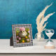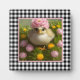 la placa de la mesa de bonito muestra un cuadro de arte digital de una niña entre flores rosadas y amarillas con fondo de rayo de gingham blanco y negro.