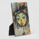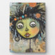 Una dama caprichosa con grandes ojos verdes y labios rojos purgados ocupa el centro del escenario con un fondo adornado con partituras musicales y diseños abstractos. La cabeza del personaje está rodeada por un halo de pelo negro, de punta verde, con elementos decorativos como cuentas y espirales, mientras que el cuello parece mecánico con resortes y engranajes.