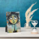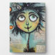 Un carácter caprichoso, con ojos grandes y expresivos y una cabecera colorida y pluvial, domina el primer plano frente a un collage de textos escritos y elementos abstractos en el fondo. La figura tiene un encanto peculiar, con sus características desproporcionadas y sus colores vivos.