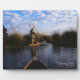 Las fotos y regalos de la naturaleza del Delta del Okavango muestran una hermosa fotografía de un viaje en un mokoro, una canoa excavada, en el Delta del Okavango en Botsuana África, tomada por Kurt Keller con una cámara de 35 mm mientras estaba en un safari africano en Botsuana. Un hombre de la barra se para en el mokoro frente al paso propulsándolo a través de las aguas poco profundas del delta parándose en la popa y empujando con un asta. Esto se tomó en 2000, el primer año después de 10 años de sequía. El campamento en el que nos quedamos había estado dando excursiones en jeep hace años en el mismo lugar en el que ahora estamos en botes. El delta del Okavango, o pantano de Okavango, es el delta interior más grande del mundo. Se forma donde el río Okavango se vacía en un pantano en una cuenca del desierto de Kalahari, donde la mayor parte del agua se pierde por evaporación y transpiración en lugar de drenar en el mar.