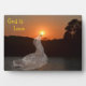 Esta placa de calidad muestra una escena de puesta de sol con el mensaje inspirador de que Dios es amor que expresa comodidad y paz.