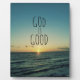 Dios es Buena Cita con fondo de temática playera. Atardecer sobre el océano enmarca la inspiradora y motivacional cita/mensaje cristiano "Dios es bueno"