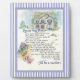 TEXTO: "Excusa esta casa - Algunas casas tratan de esconder el hecho de que los niños se refugian ahí; nosotros nos jacta de ello abiertamente, las señales están por todas partes. En cuanto a las manchas en las ventanas, hay pequeñas manchas en las puertas. Creo que debería disculparme por los juguetes esparcidos en el suelo. Pero me senté con los niños y jugamos y reímos y leemos, y si el timbre de la puerta no brilla sus ojos en cambio brillará. Porque cuando a veces me veo obligado a elegir un trabajo del otro, quiero ser ama de casa, pero primero seré madre". PALETA DE COLOR: azul cielo, blanco suave, azul, verde y rosa. ESTILO DE DISEÑO: Una encantadora casa de campo con postigos y objetos de valor se encuentra al fondo con un bate de béisbol, mitt y bola en el césped y una pequeña muñeca tendida cerca de las flores del jardín. El texto ha sido calligrafiado a mano por Audrey Jeanne Roberts y todo el diseño es una pintura acuarela a mano original. La primera oferta en nuestra línea de productos de regalo "Audrey Jeanne's Expressions" ha sido actualizada con los colores actuales. Una "mate" de rayas de color agua de mano y una "alfombra" interior de colores coincidentes terminan el diseño. Un gran recordatorio de lo que es realmente importante en la vida - especialmente bueno para las nuevas madres como regalo de ducha de bebé o regalo para el recién nacido.
