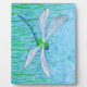 Lápiz de color ACEO de una libélula verde y azul que explora las hierbas en busca de presas.