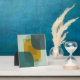 A modern, abstract geometric poster design featuring overlapping translucent shapes. The composition is divided into four quadrants with textured, muted background colors (soft teal, light sage, dark charcoal/slate). Central to the design are a large, vibrant mustard yellow curved shape and several partially visible, translucent teal/grey circles and rectangles. The artwork is characterized by its sharp lines, clean edges, and contemporary color palette, creating a sense of depth and dynamic movement through the interplay of transparency and opaque forms.